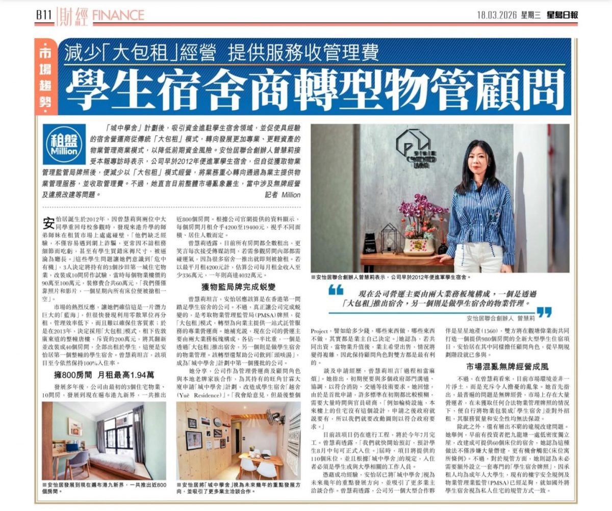 香港物業管理 #安怡居 #學生宿舍營運 #星島日報專訪 #品牌故事